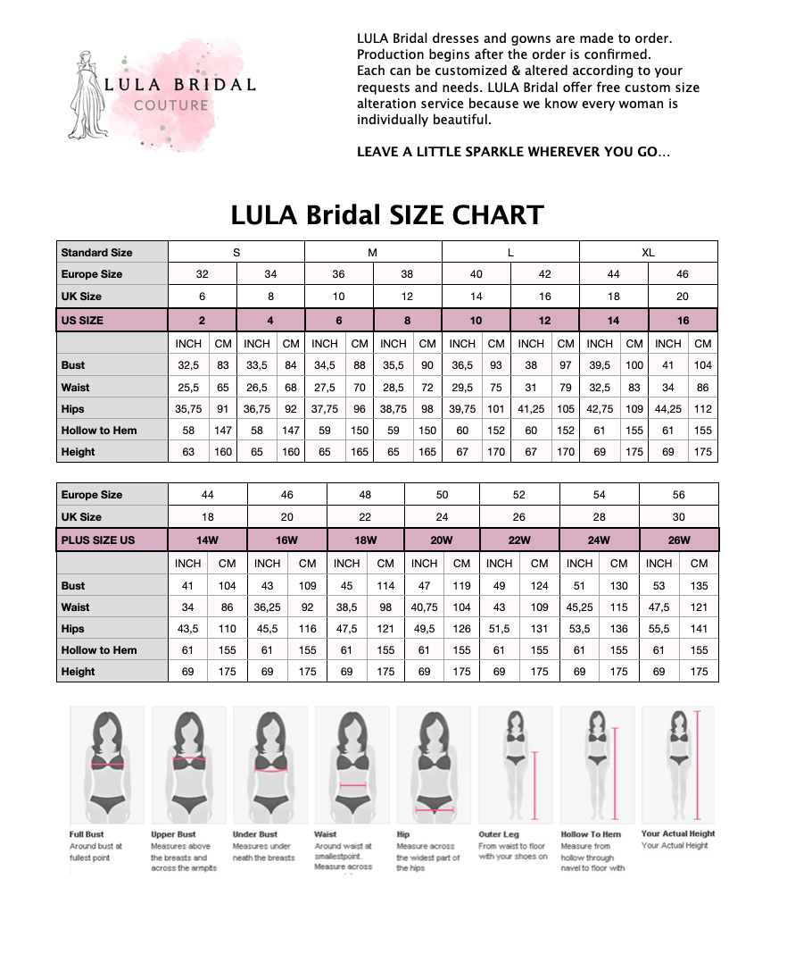 Alle unsere Kleider werden individuell für jeden Kunden individuell angefertigt. Auch die Standardgrößen werden auf Bestellung angefertigt, daher empfehlen wir dringend, in Sondergrößen zu bestellen.