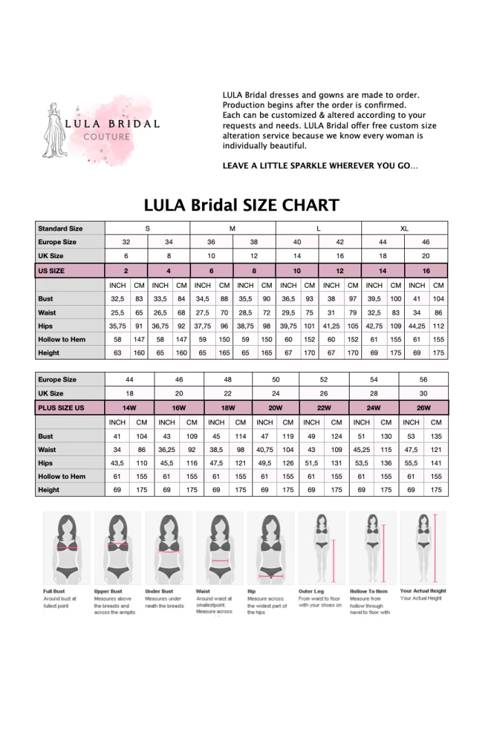 Alle unsere Kleider werden individuell für jeden Kunden individuell angefertigt. Auch die Standardgrößen werden auf Bestellung gefertigt, daher empfehlen wir dringend, in Sondergrößen zu bestellen.
