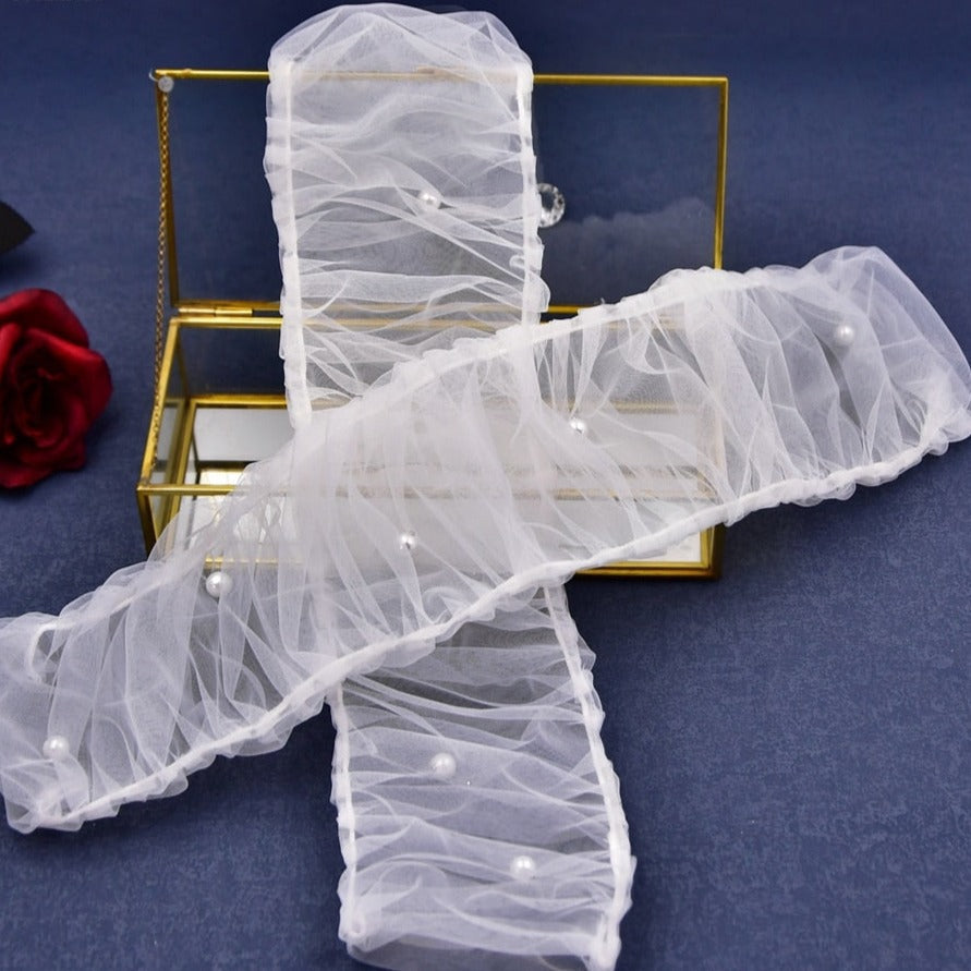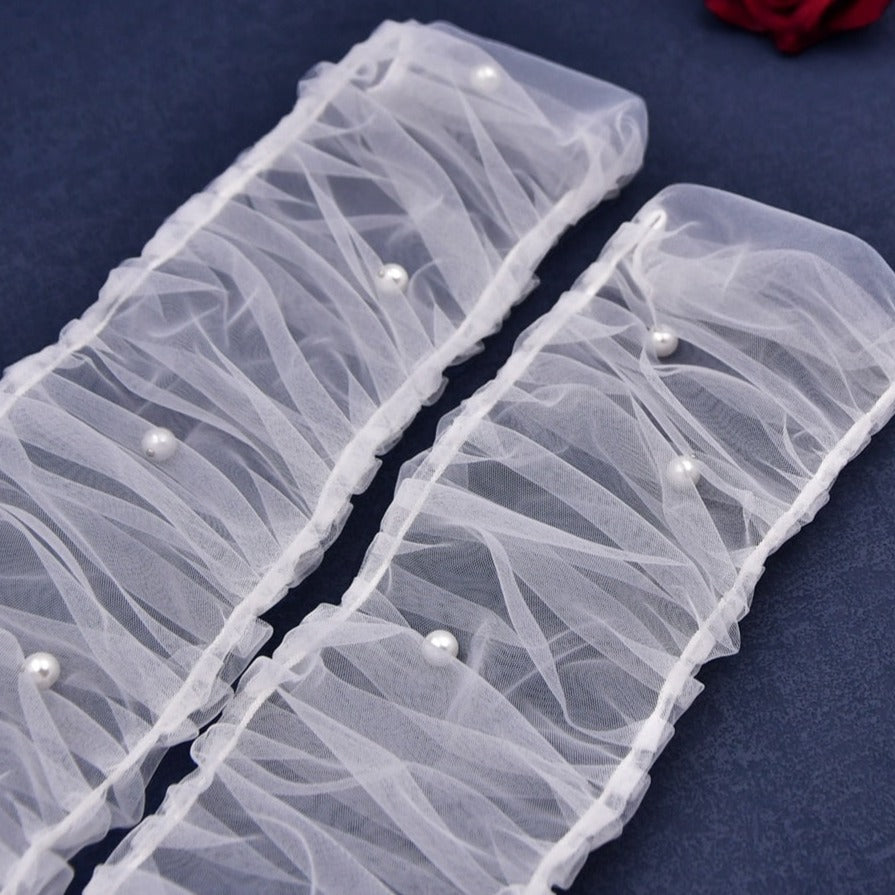 Add a touch of elegance to your wedding look with our removable ruched bridal sleeves, beautifully adorned with pearls. Available with glittes tulle as well for sparkling sleeves.