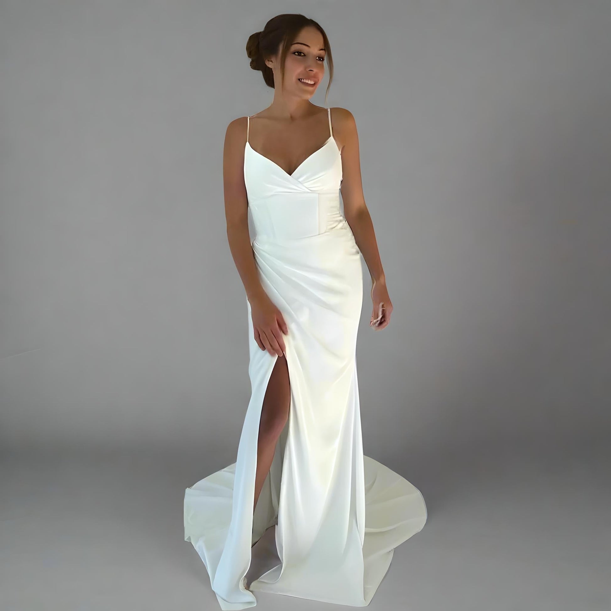 With delicate spaghetti straps, a plunging V-neckline, and a unique overlapping pleat that reveals a bold side slit, the Mirabel dress is both alluring and sophisticated. The sweep/brush train adds soft drama, making it a stunning option for beach, destination, or modern urban weddings.