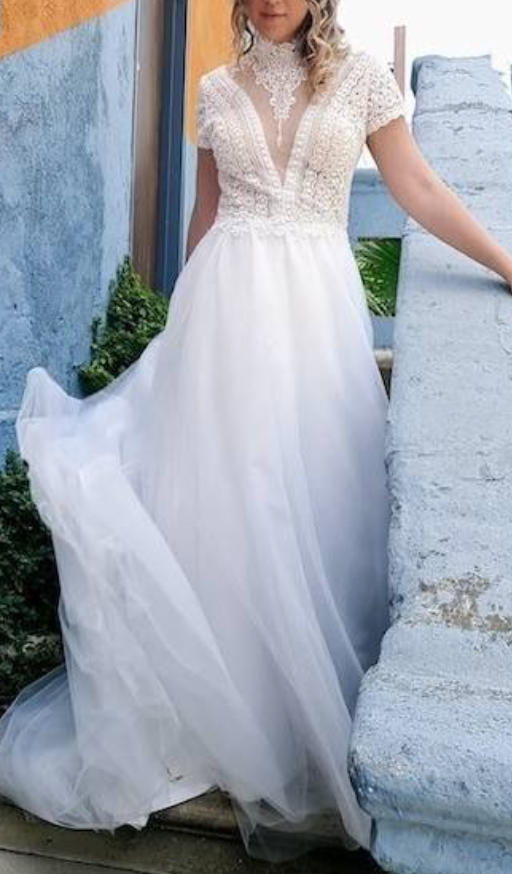 El vestido de novia NOVA es una elegante combinación de encaje bohemio y detalles de diseño chic, con cuello alto, mangas cortas, una hermosa cola y una construcción sin espalda. Ofrece una silueta impresionante perfecta para la novia moderna.