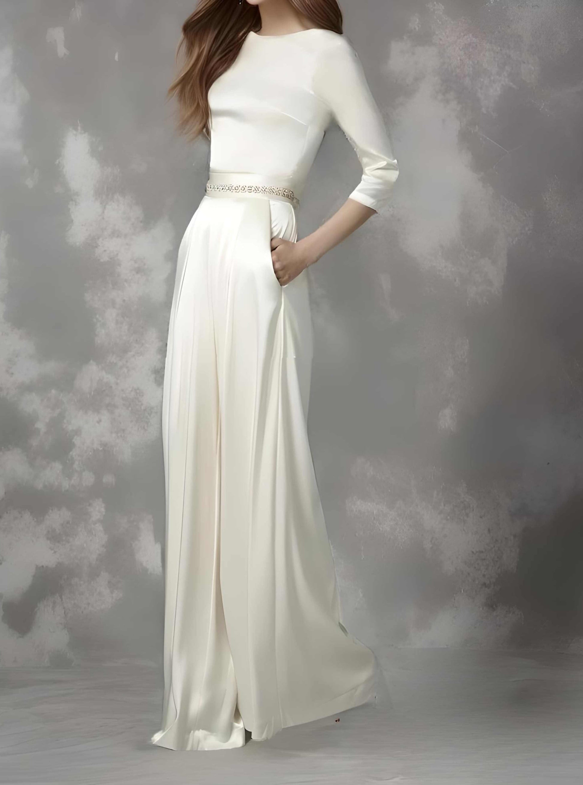 Indulge in the sheer elegance of our Simple O-Neck White Jumpsuit, designed specifically for your wedding day. This exceptional piece effortlessly combines modern sophistication with classic charm, ensuring you look and feel truly remarkable. Crafted with meticulous attention to detail, our jumpsuit exudes an aura of grace and refinement that will captivate everyone around you.