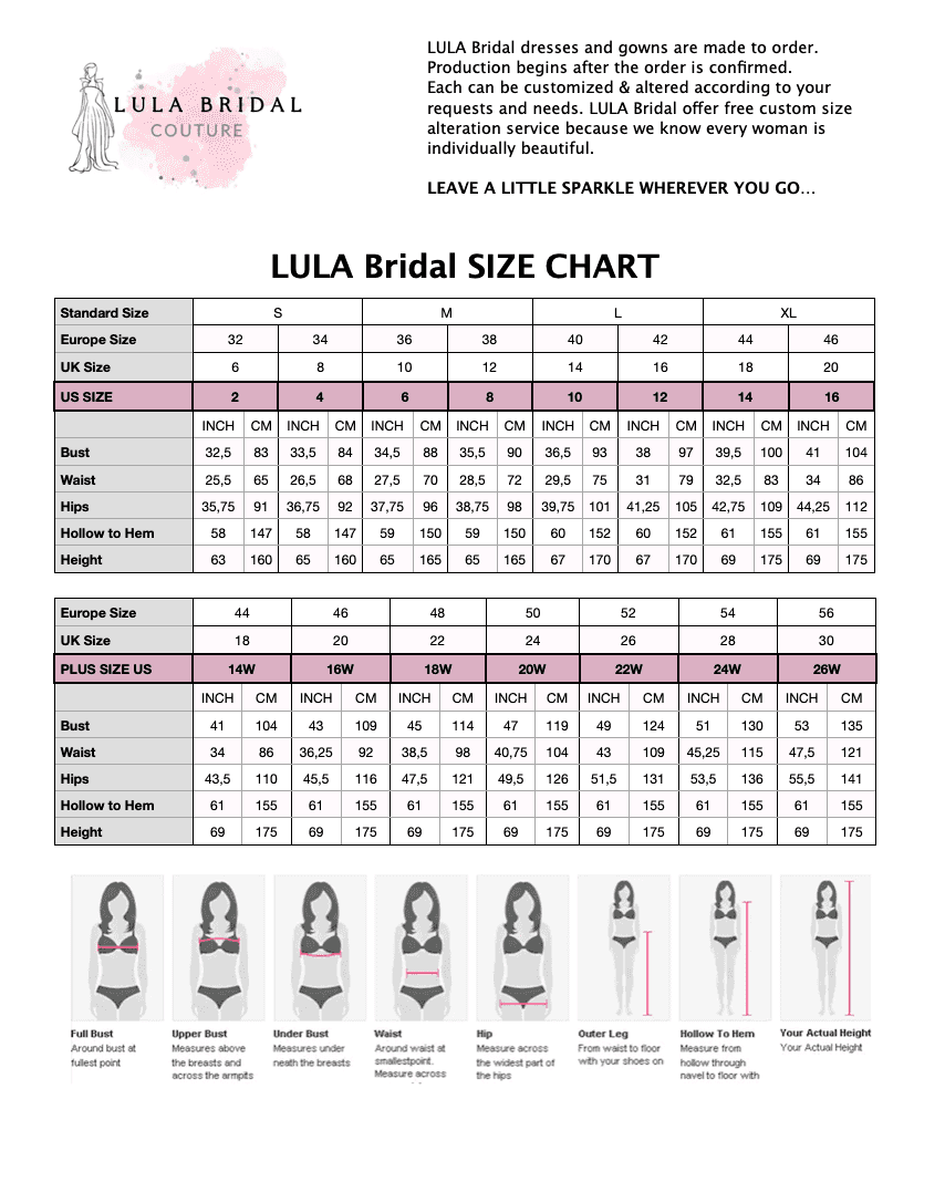All our dresses are made to order uniquely for each customer. The standard sizes are made to order as well, therefore we highly recommend ordering in custom size.