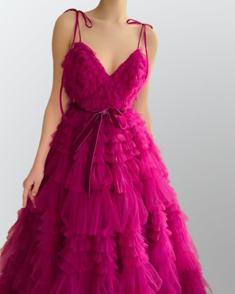 Embrace your inner princess as you twirl and dance through the night, the cascading layers of fuchsia ruffles gracefully swaying with every step. The ethereal tulle fabric adds a touch of magic, creating a dreamlike aura around you.