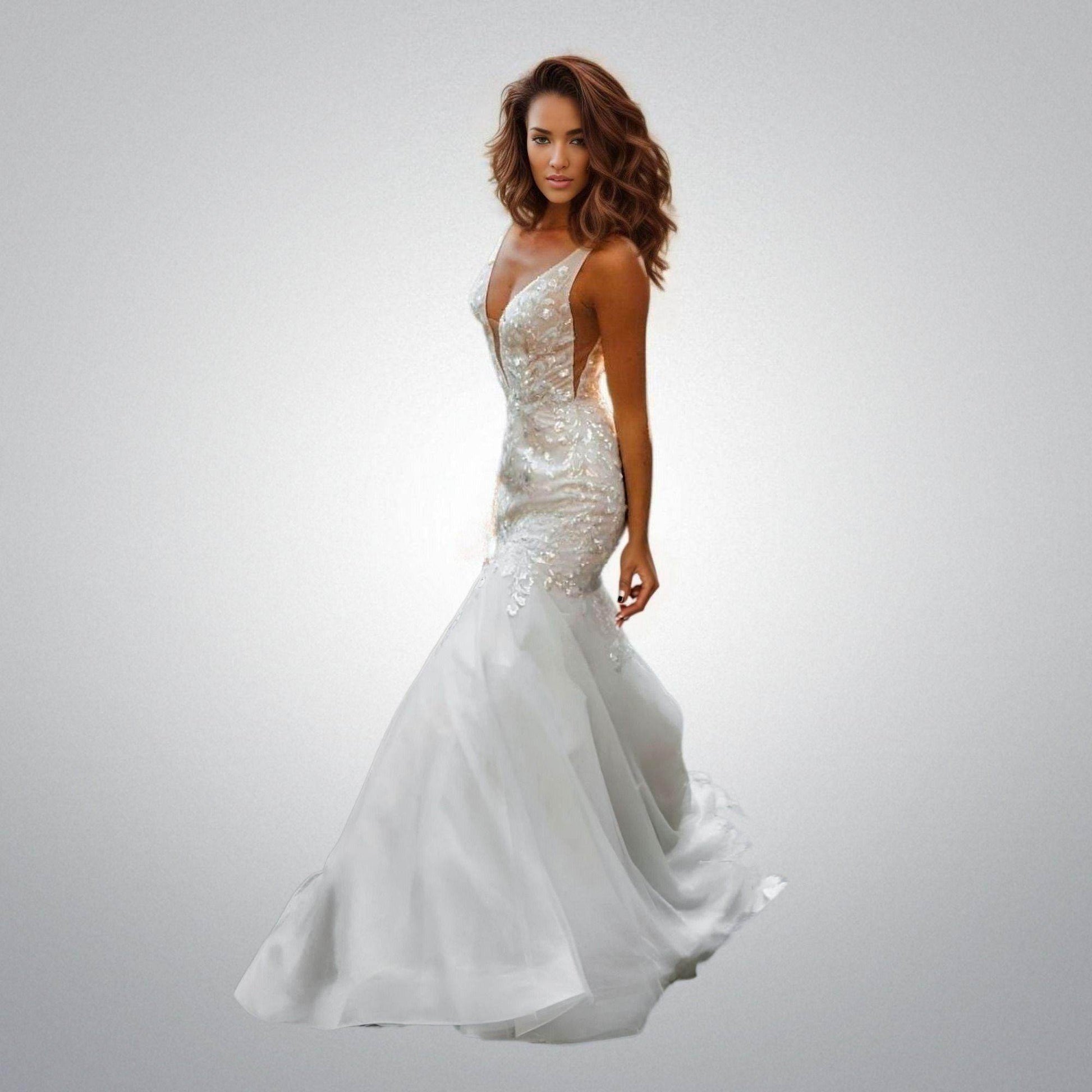 Rustic sexy mermaid wedding dress with appliqued bodice and tulle skirt.