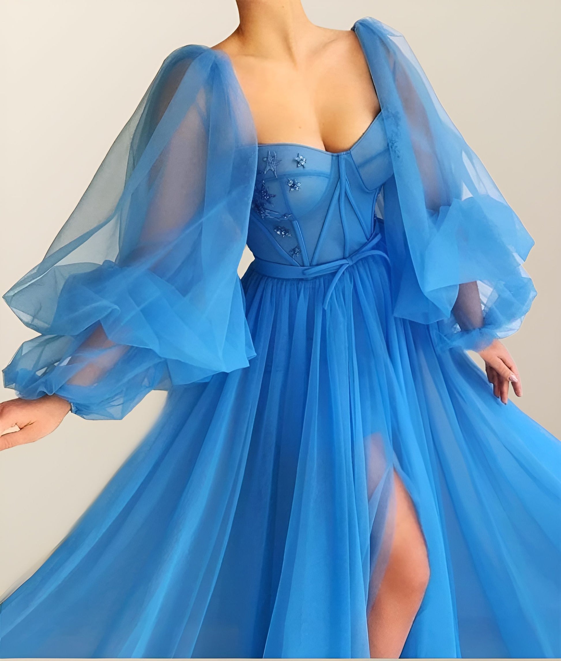 Blue evening dress with long puff sleeve with exposed boning and high slit.