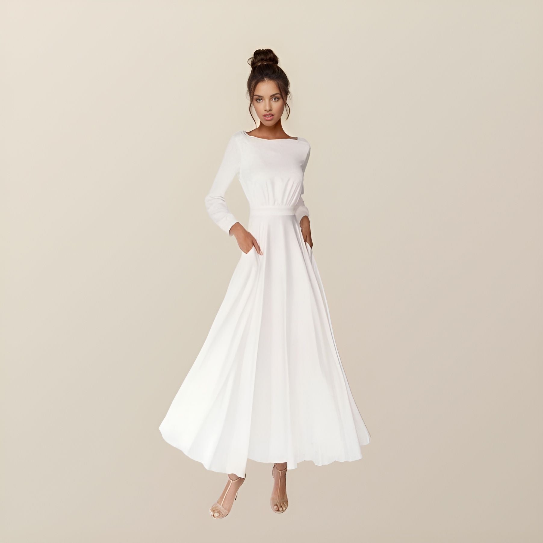 The GIA short wedding dress combines simplicity and elegance for the modern bride. This ankle-length A-line gown features long sleeves and a flattering pleated design. With its practical pockets and timeless silhouette, it’s perfect for brides seeking a chic and understated look on their special day.