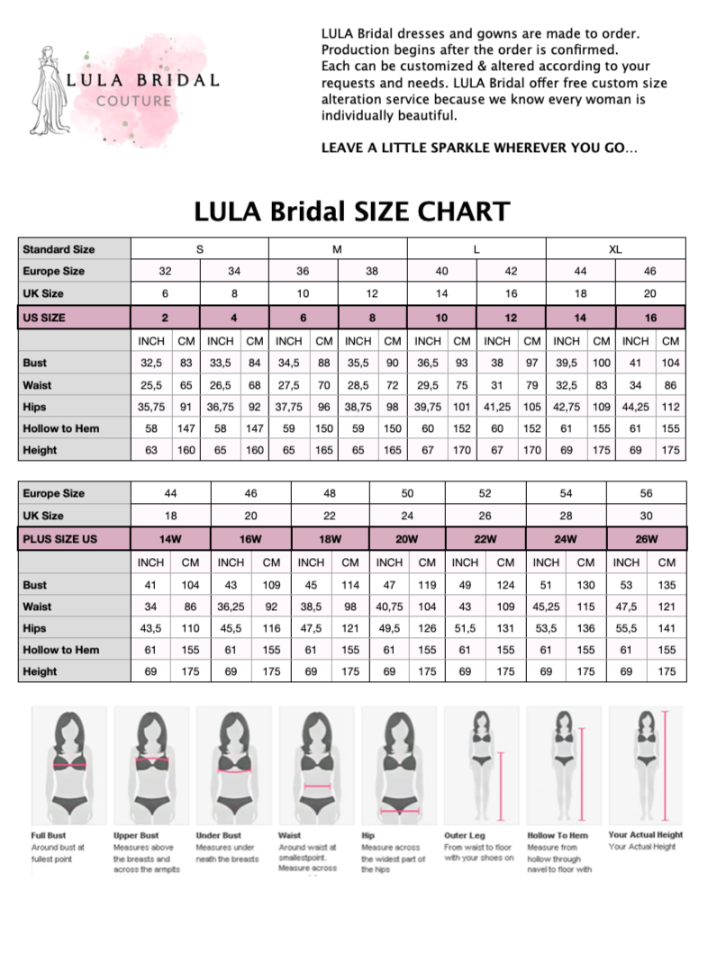 All of our gowns are handcrafted, made to order and can be customized or altered according to your requests. Production begins after the order is confirmed.